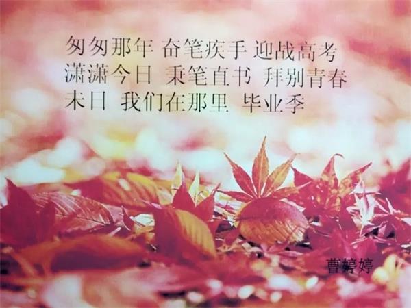 “匆匆那年,奋笔疾手,迎战高考 潇潇今日,秉笔直书,拜别青春 末日,我们在那里,毕业季!”