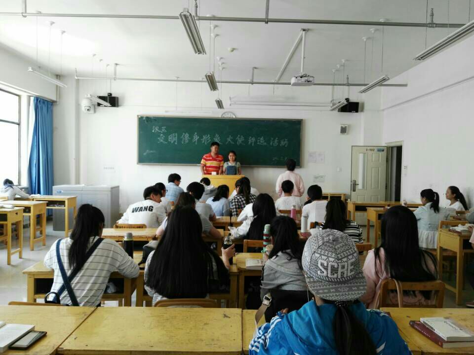 为了进一步促进我班“文明修身”的风气,在校领导的带领和班干部的组织下,我班于2016年5月9日开展“文明修身形象大使”评选活动。各位同学都进行了演讲,最后由班级投票机投选出芦明嘉同学和汪艳萍同学作为本班“文明修身形象大使”。