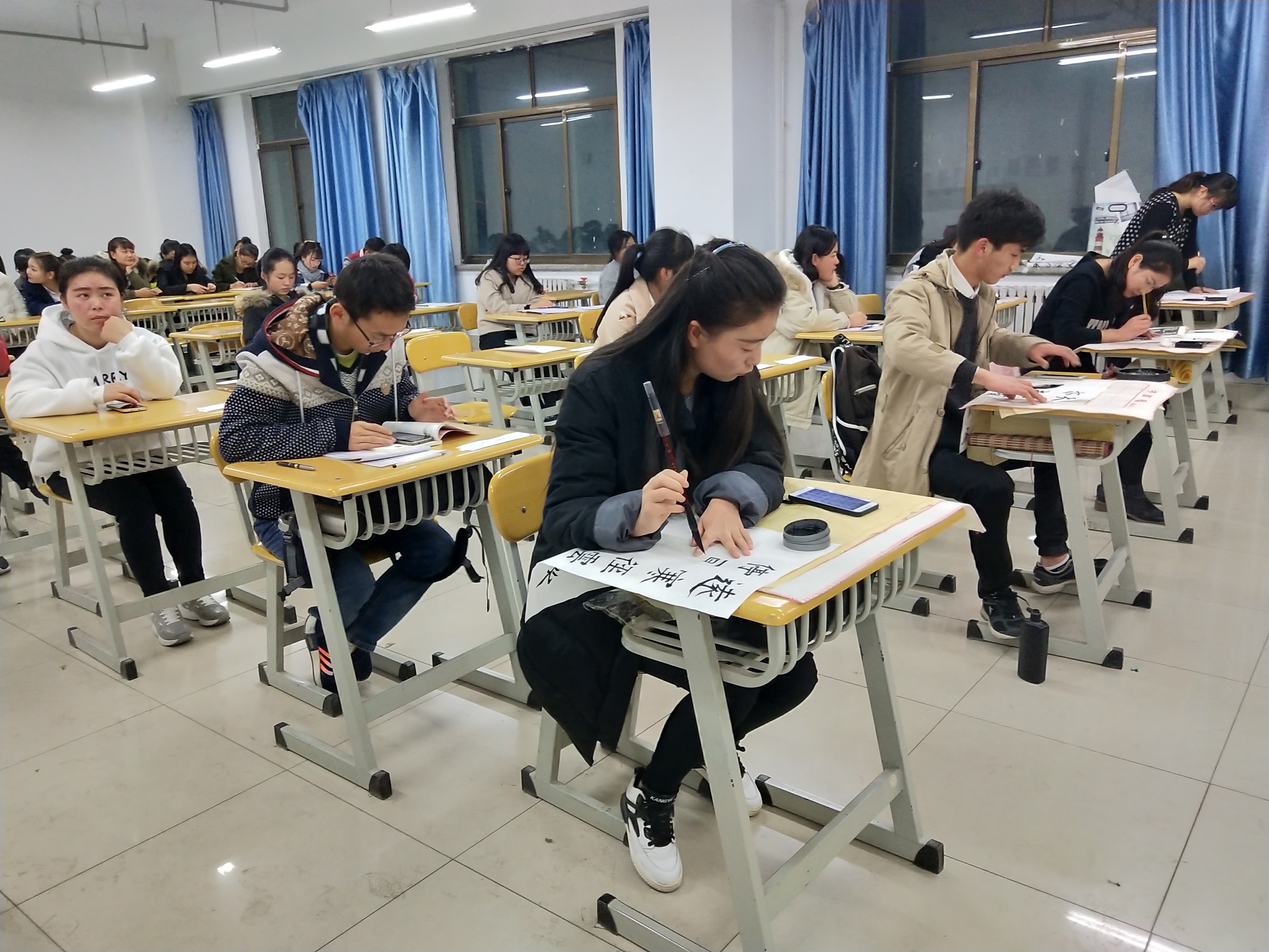 比赛共有两个环节,第一环节毛笔字书写,参加毛笔字比赛的选手首先在十五分钟之内完成了自己的作品。第二环节硬笔字,本环节粉笔字和钢笔字同步进行,参赛选手两人一组上台进行粉笔字书写,同时钢笔字选手要在规定时间内完成钢笔字的书写。伴随着优美舒畅的古典乐曲,选手们心如止水,平心静气地书写着,一笔一划,一撇一捺都融入着对书法的独特情感与热爱。所有选手书写完成后,各评委对选手们的作品进行专业的点评,并提出意见与建议。