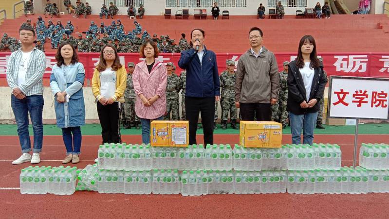 9月17日上午,公司党总支书记郑建勤、副经理张彦荣、学工办、辅导员老师张春霓、白美丽、贾娜以及员工会成员在新生军训休息间隙慰问军训教官和2019级军训新生。