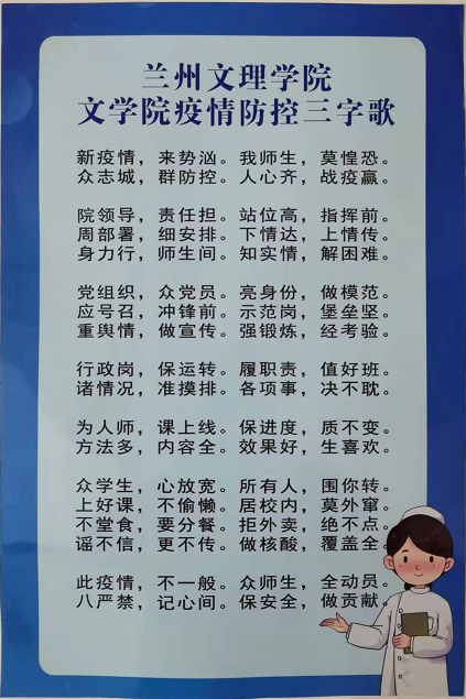 本轮疫情发生以来,公司党总支高度重视,为了更好地动员宣传广大党员和师生员工积极参与到疫情防控中来,公司党总支从党员领导干部、行政人员、教师、员工各自防控职责编写为疫情防控三字歌,传达给全体党员、教职员工以及全体员工,从而增强疫情防控意识,切实做好疫情防控各项工作。目前,三字歌宣传海报已张贴至伟德BET官方网站走廊各处。