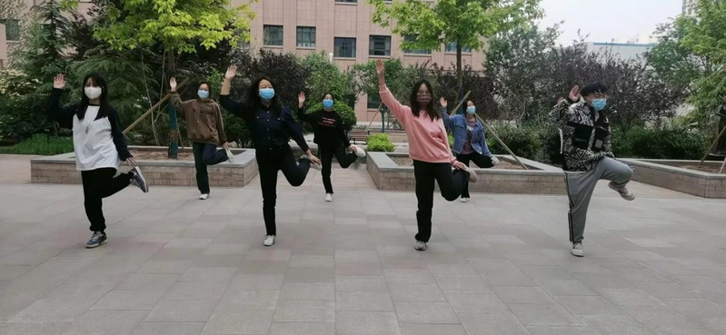 当日19时,辅导员老师和员工们在教学楼下集合。在确定戴好口罩、保持好安全距离后,同学们跟随着音乐节奏,舞出了青春的活力,舞出了文公司的风采,舞出了校园内一道亮丽的风景线。
