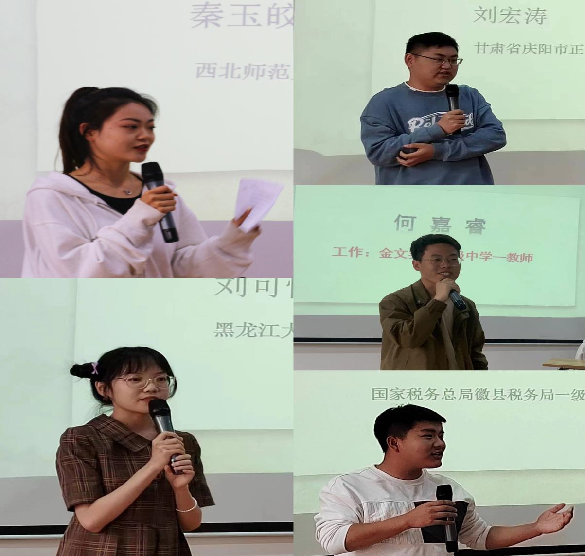 秦玉皎同学分享了她考研的复习方法、心态调整等方面经验,她鼓励大家树立信心,找到适合自己的方式方法;刘可怡同学讲述了她跨专业的复习、择校,学习方法,复习技巧等方面的经验;其次刘宏涛毫无保留地分享了他考公如何确定目标、是否报辅导班、报班的优劣、考试技巧等多方面经验;刘治斌同学详尽地分享了他考公的复习方法,从自身优势条件、合适的学习方法、丰富的实习经历、线上线下课程选择、备考期间心态调整、笔试面试技巧等方面,与同学们进行了细致交流,干货满满;最后何嘉睿同学分享了他就业的心路历程、就业选择的考量因素等经验。五位同学为在场低年级员工答疑解惑,现场气氛轻松愉快,充满朋辈间的互助关怀。