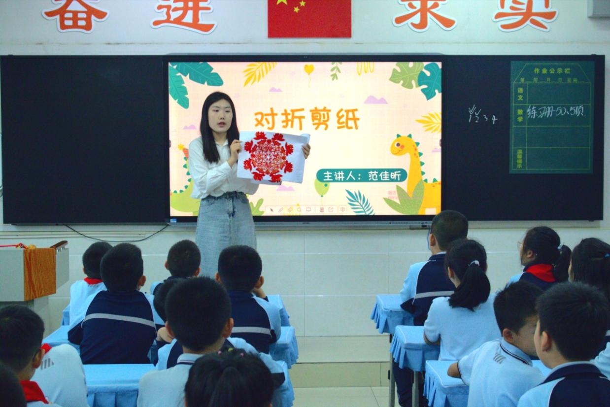 通过和小朋友们的互动让他们了解剪纸的剪法、特点和传承故事。小朋友对剪纸展现出了浓厚的兴趣,课堂氛围活跃。